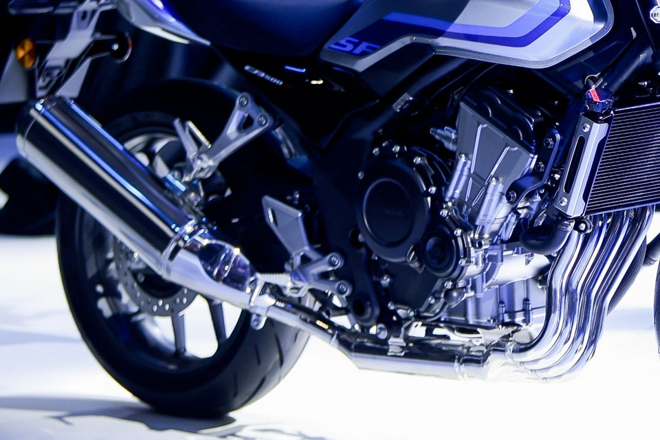 雖然 CB500SF SUPER FOUR 繼續使用鋼管車架及長方型尾搖臂,但經過重新設計後,外觀與 HORNET 750 及 CBR250RR 使用的車架相似,尾搖臂用鋁合金製造。新車少不了當然是直列四汽缸引擎,配上立立令的不鏽鋼四條焦排氣管,而 HONDA 更被喻為是發揚四缸主義的車廠。