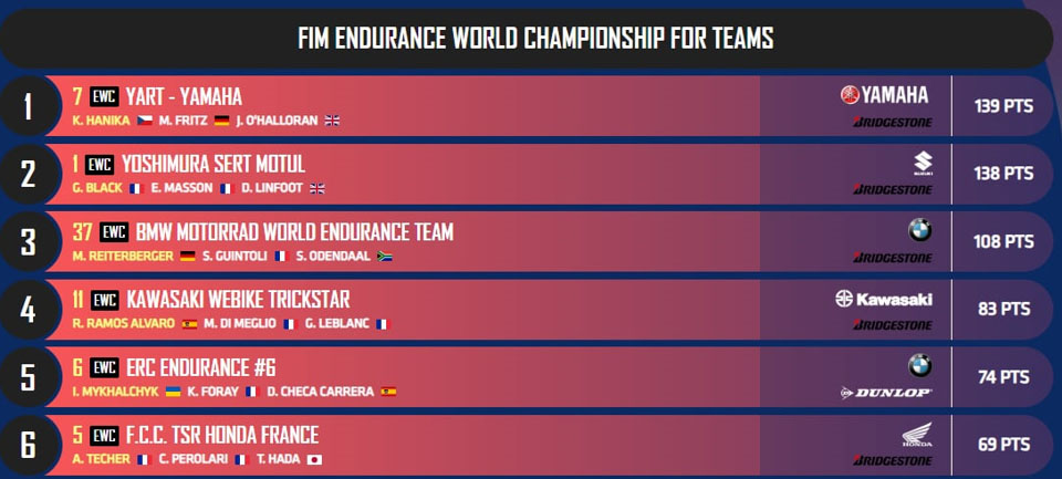 命運逆轉 —— YAMAHA YART廠隊迎來第三座世界冠軍 BMW的退賽,意外成就了YART。車手Marvin Fritz、Karel Hanika與Jason O’Halloran在比賽中歷經失誤,鬆脫的包圍令他們損失時間,隊內更有車手因病未能正常輪替,Fritz與O’Halloran只得加倍出場。原本他們僅能爭取全場第三,但BMW的退賽讓YART最終以第二名衝線,積分反超,僅以1分之差擊敗吉村Yoshimura SERT Motul車隊,驚險奪下2025年世界冠軍。
