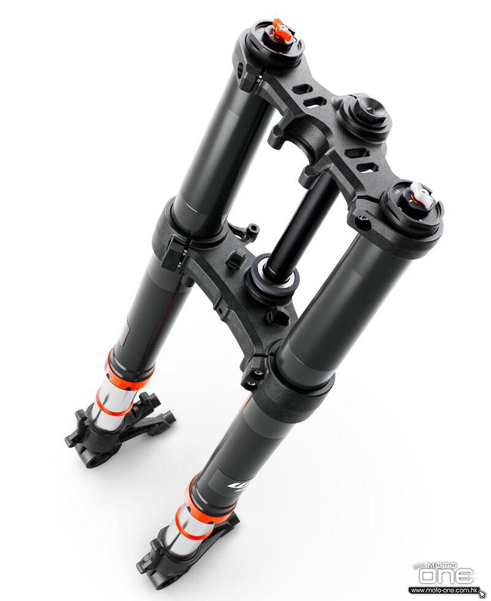 可調式倒立前叉 一如其他KTM車型,990 RC R使用WP避震,車子採用直徑48mm的WP APEX倒立前叉,行程130mm。這套系統以賽道為開發基礎,同時兼顧行駛與駕駛的靈敏度;每支前叉皆配上全新設計的33mm黑色陽極眼鏡(triple clamp),以應付高性能操控需求。