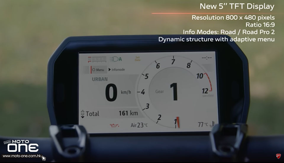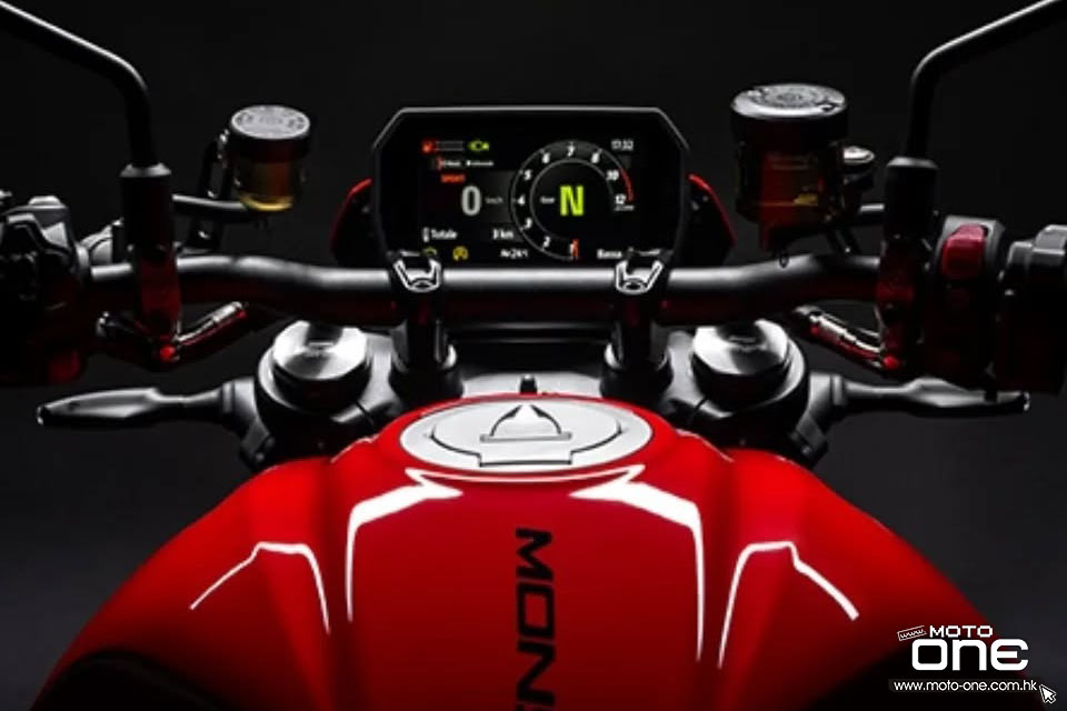 騎士透過 5 吋彩色 TFT 儀錶板,可以操作 MONSTER 各項電子功能。透過介面,車主可切換四種騎乘模式——Sport(運動)、Road(道路)、Urban(市區) 及 Wet(濕地)——並調整所有由電子輔助駕駛系統,結合六軸慣性測量單元(IMU) ,讓騎士更易控制馬力。