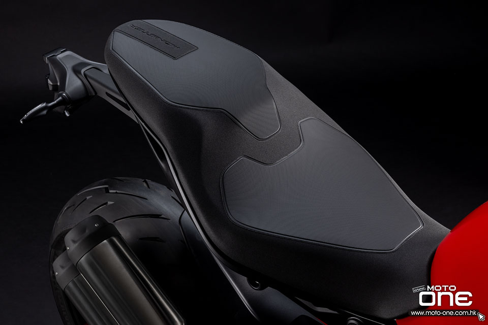 更貼地的座高設定 新款 MONSTER 在舒適性方面亦作出不少改進。座高由上一代的 820mm 降至 815mm,而座墊亦回歸一體式設計,取代了上一代 937cc MOMSTER 的分層雙座造型。