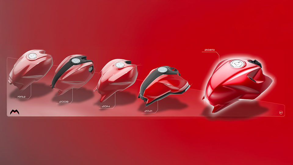 DUCATI 表示,車側黑色塑料外殼上壓製的網格紋理設計,有助提升膝部抓地感,防止騎士在煞車時向前滑動。