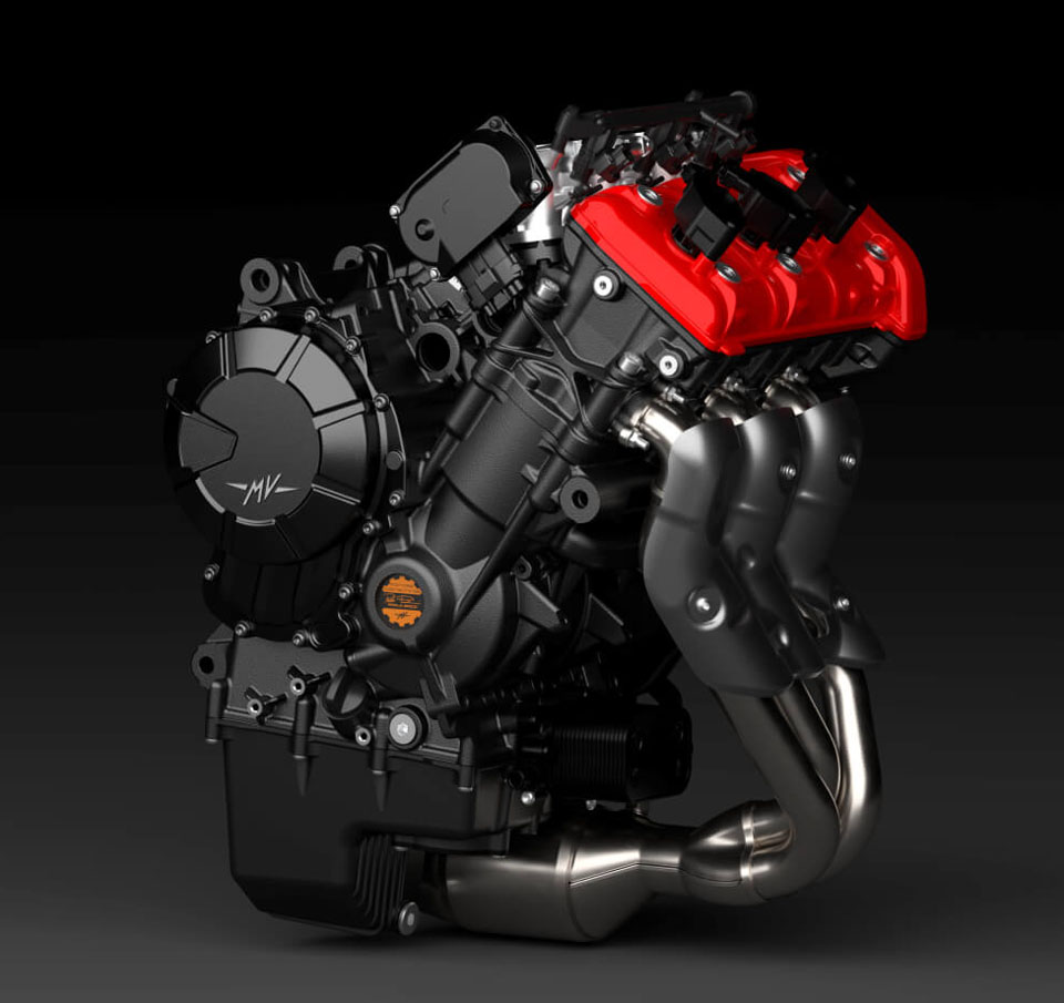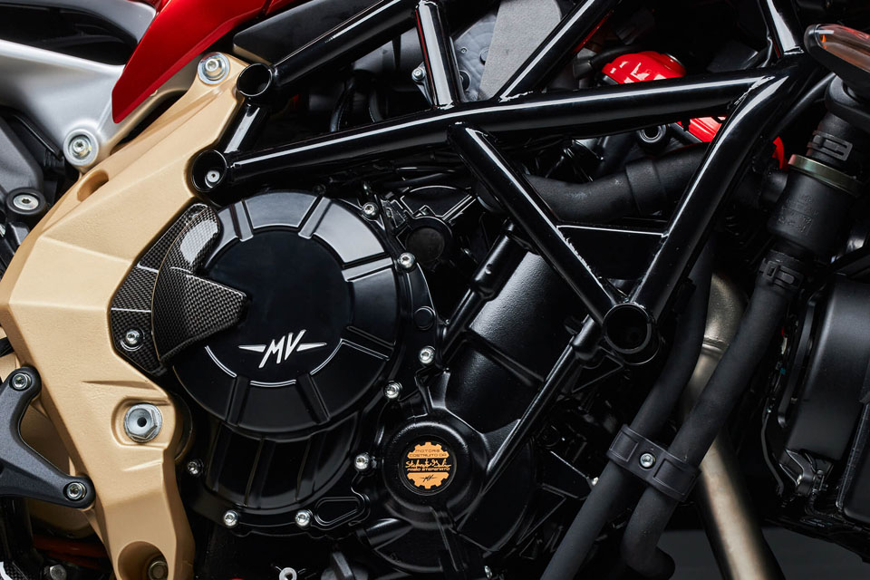 三缸引擎 Brutale Serie Oro 採用全新 950 EVO 三汽缸引擎,它源自同廠冒險型 Enduro Veloce 所使用的 931cc 引擎,但經過全面強化。新引擎採用反向旋轉曲軸、更大的鋼製氣門、新設計的氣缸頭與凸輪軸、重新設計的燃燒室,以及改良的冷卻與潤滑系統。最大輸出達 148 匹馬力/11,200 rpm、107Nm 扭力/8,400 rpm,而在 3,500 rpm 時已可輸出 85% 的扭力。屬於一款扭力型 NK 車,在市區騎乘時無須頻頻轉波。