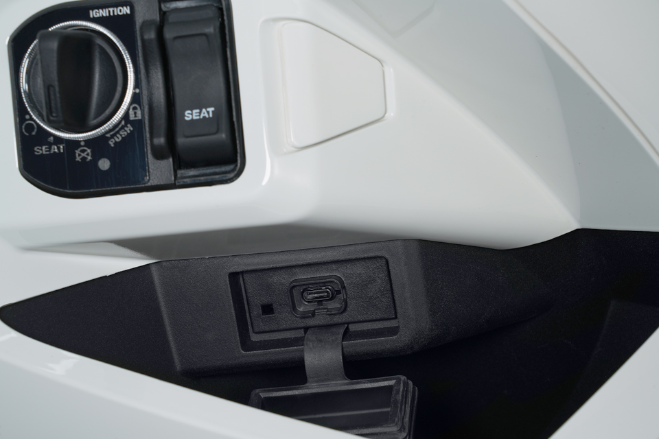 USB Type-C充電接口及前置儲物空間設計靈活,讓用家能夠輕鬆收納隨身物品。配備可折疊式腳踏,為後座乘客提供腳部放置空間。座底空間可收納一頂開面頭盔,而底置油箱設計則可騰出更多空間,令平地台更加寬倘,方便用家置物,滿足日常出行需求。澳門市場發售版本標配尾箱,能夠提供34L額外儲物空間(約可容納2頂開面頭盔),增強車輛運載能力及實用性。
