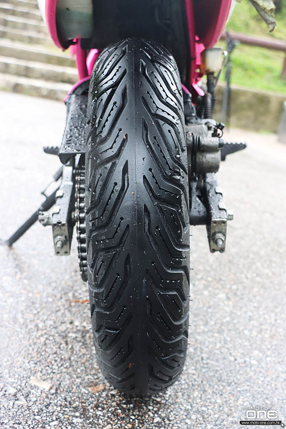 今次特別等到雨天才進行的City Grip 2濕地測試,安裝於細車仔KSR的這對City Grip 2輪胎,是全新輪胎,完全沒有刻意開胎,因為City Grip 2的胎質表層是刻意少一層開胎的蠟質﹐所以客人更換後不用刻意開胎,亦沒有此需要。新胎已經有一定的濕地抓著力,基本上一安裝後就可以濕地行駛。