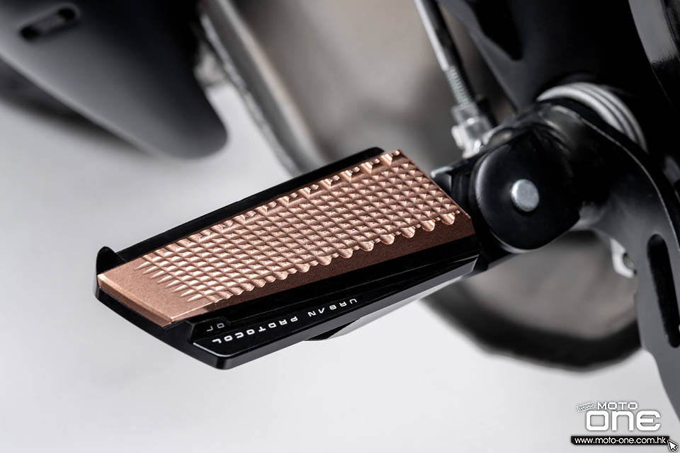 Scrambler Ducati 10° Anniversario Rizoma Edition 以穩重的黑色為主調,搭配黑白配色的油缸及純白乘客扶手,已經非常引人注目。而 Rizoma 更大膽地選用了「Metal Rose」金屬玫瑰色作為L型引擎蓋、車架蓋、引擎檢視蓋、腳踏板及風擋的主色調,進一步強化視覺吸引力,同時提升車輛的功能性與駕駛體驗。「Metal Rose」色調散發出自信氣質,搭配黑白車身設計,使整體外觀呈現出獨特而未來感十足的風格。