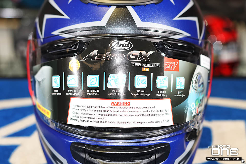 ARAI ASTRO-GX STAR & STRIPE 星星與條紋的巡航型號全面頭盔 今次ARAI ASTRO-GX STAR & STRIPE備有兩色選擇,兩者採用相同的星星與線條紋拉花,分別是亮面白紅藍配螢光黃線,另一是啞面黑紅藍配灰線,亮與暗成為強烈對比。
