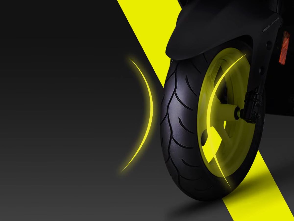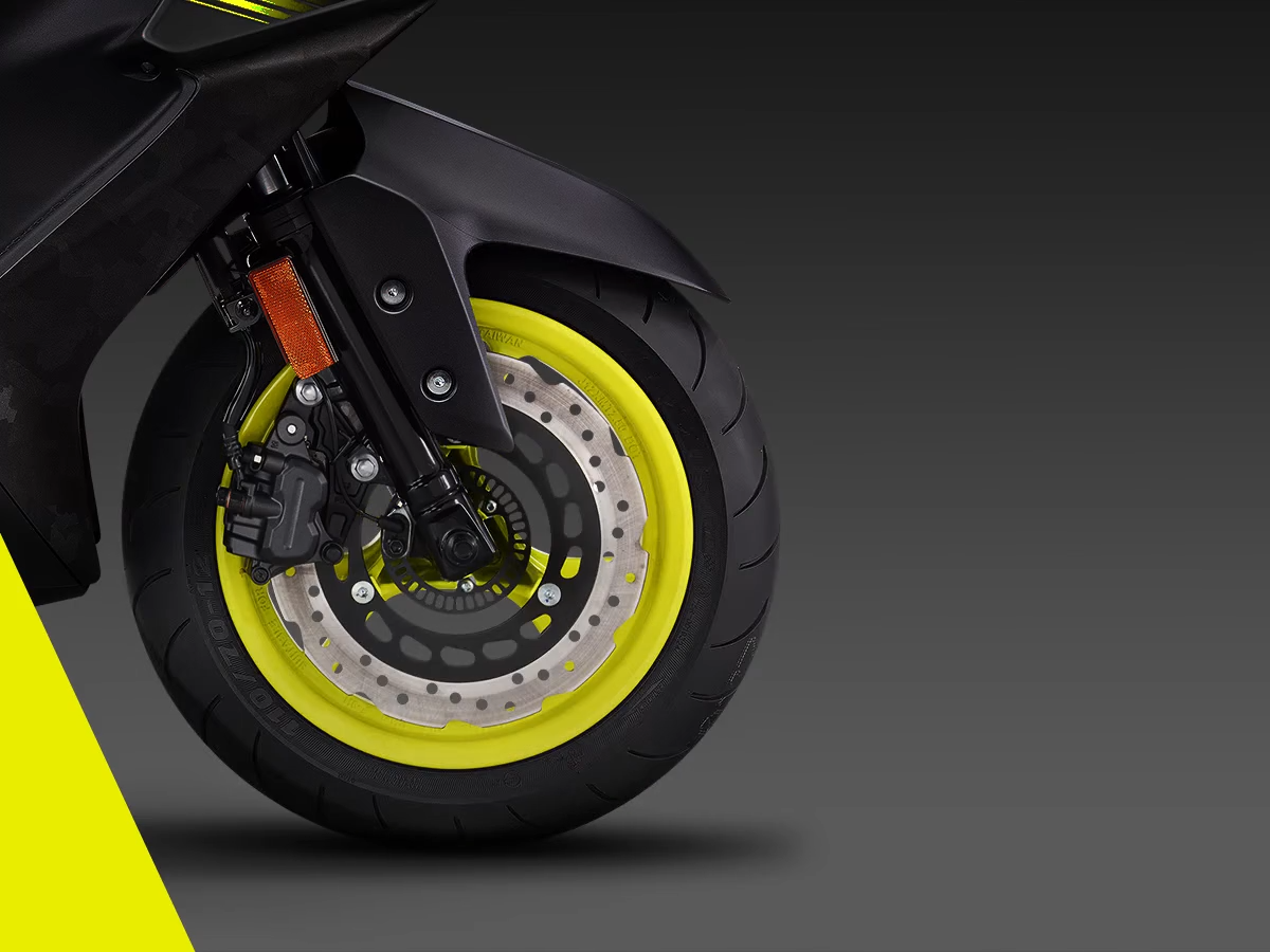 前輪採用胎徑增大的規格(110/70-12),輪框尺寸採用MT2.5,搭配高性能MAXXIS R1N輪胎,轉向靈活操控性靈敏。配合加大胎寬,彎道操縱時,完全滿足熱血騎士的肆性,玩樂的駕馭要求。
