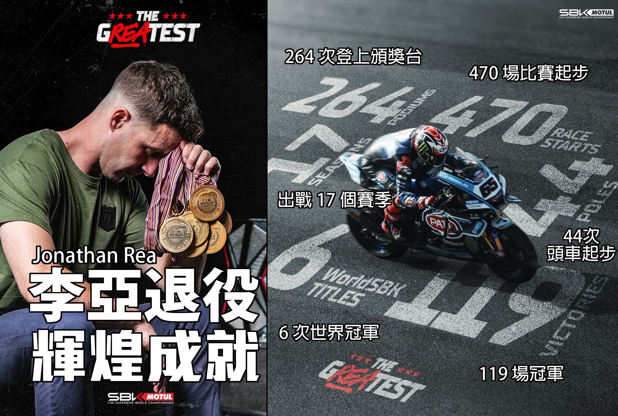 另一方面,總共奪得 6 屆 WSBK 世界冠軍的李亞(Jonathan Rea),亦正式退役。李亞亦是 WSBK 史上奪得最多世界冠軍頭銜的車手。賽會亦列出了他在過去 17 年 WSBK 職業生涯中的數據。
