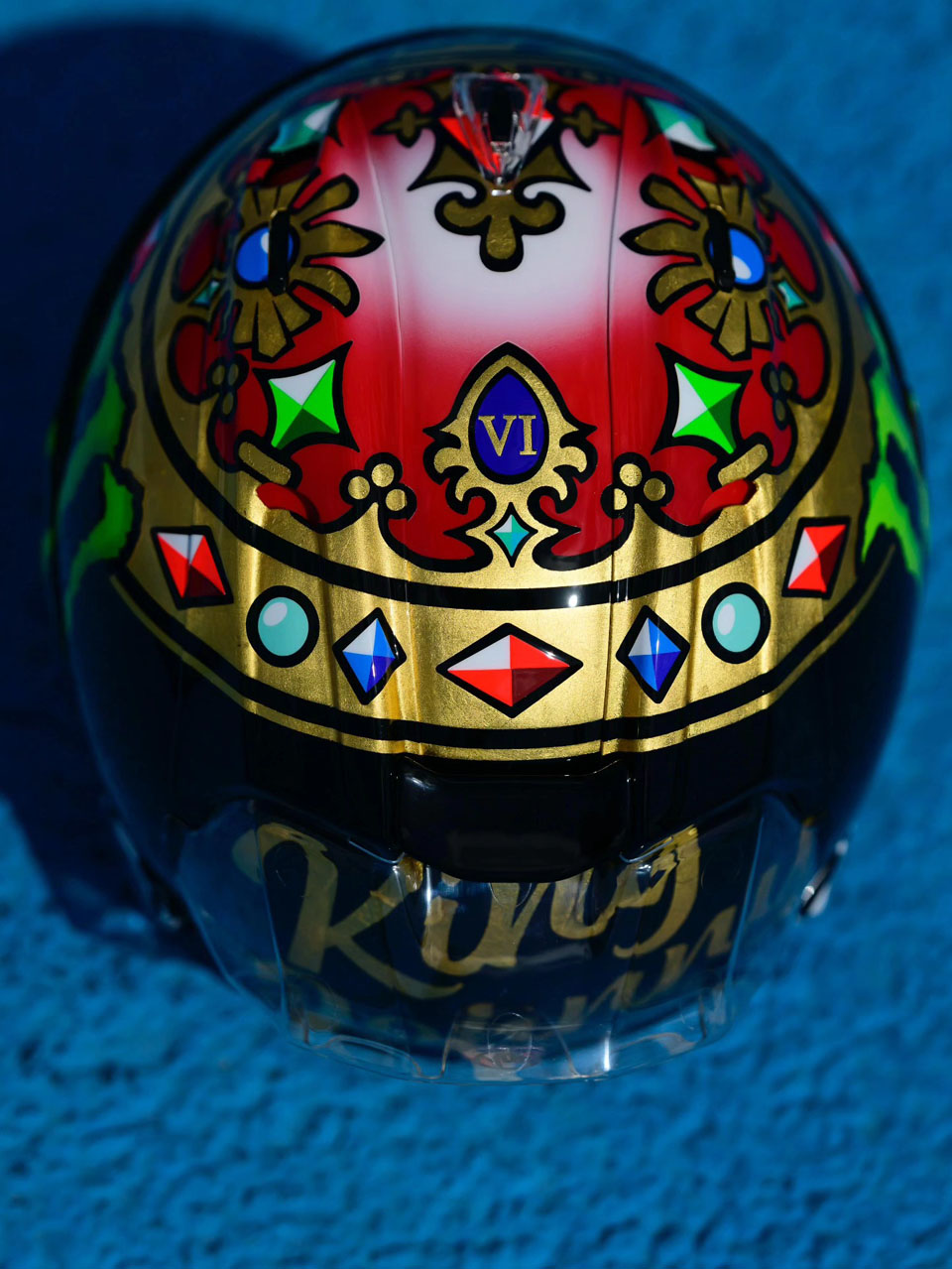 整體以皇冠為主題,以象徵榮耀與權威的金色為主調,並以紅、綠、藍、白等「寶石圖案」點綴,營造出華麗而尊貴的感覺。頭盔頂部中央印有「VI」羅馬數字,代表李亞Jonathan Rea奪得6屆WSBK世界冠軍,突顯他「六冠王」的地位。