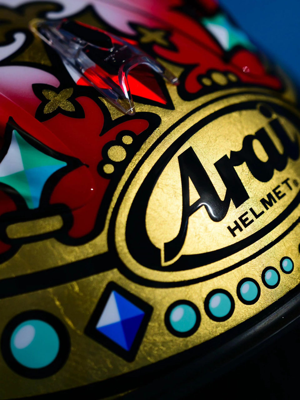 頭盔表面採用高光黑色底層襯托金紅圖案,令整體更具賽車戰鬥感與冠軍氣勢。