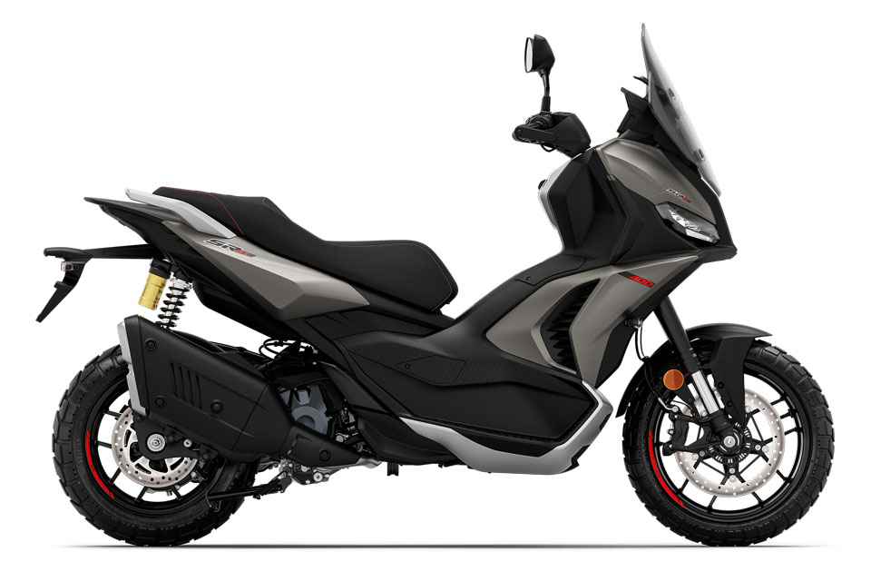 掣動系統亦同步升級。前方配置 300mm 浮動煞車碟配放射式四活塞卡鉗,後方為 240mm 浮動碟配雙活塞卡鉗;相比 SR-GT 200 的 260mm 菊花碟配 Nissin 雙活塞卡鉗及 220mm 後碟,新車的掣動性能明顯更強。