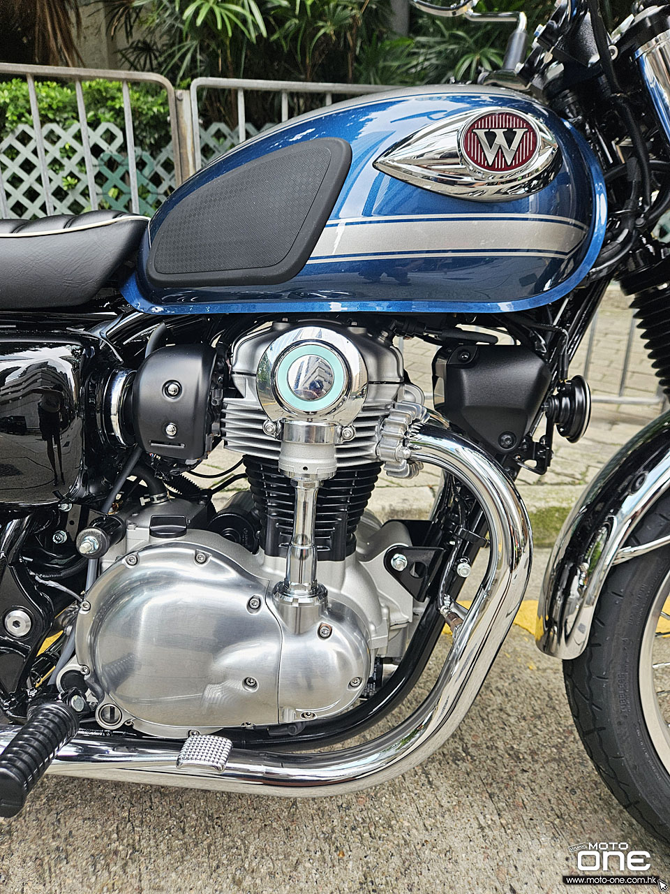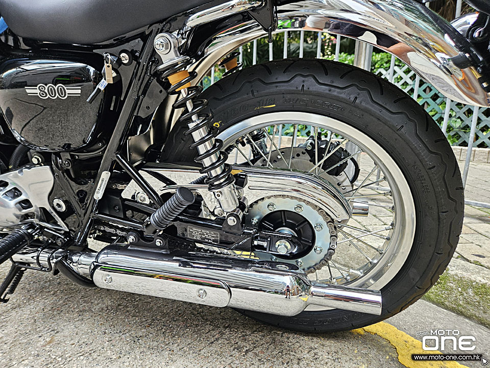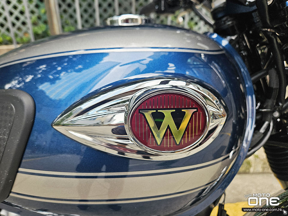 2026 Kawasaki W800 與過往相同,車身選用許多電鍍及金屬原色部件,閃亮與復古兼備,而今年W800汽缸採用藍色油缸,與金屬原色與電鍍的部品,完全的配搭。