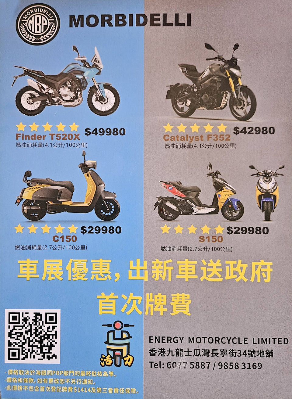 除電動車款外,活力車行亦展出ADIVA AD7 150 三輪電單車(燃油車)。該車最大賣點是其前雙輪設計,配合傳統 150c.c. 汽油引擎,在穩定性與操控性方面兼顧日常實用與高安全感,特別適合需要更高行車穩定度的駕駛者。現場亦同時展示多款 MORBIDELLI電單車(燃油車),包括 Finder T520X冒險車款、Catalyst 352街車、C150綿羊 及 S150綿羊 等,價錢定位清晰,全面覆蓋入門至中級市場。