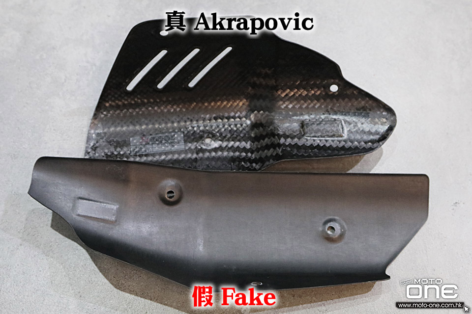 真Akrapovic 採用碳纖連樹脂製作的隔熱板,可以抵受極高的溫度。 假Fake這塊膠底的隔熱板,表面造工也不錯,但背後與真Akrapovic是完全不同等級。