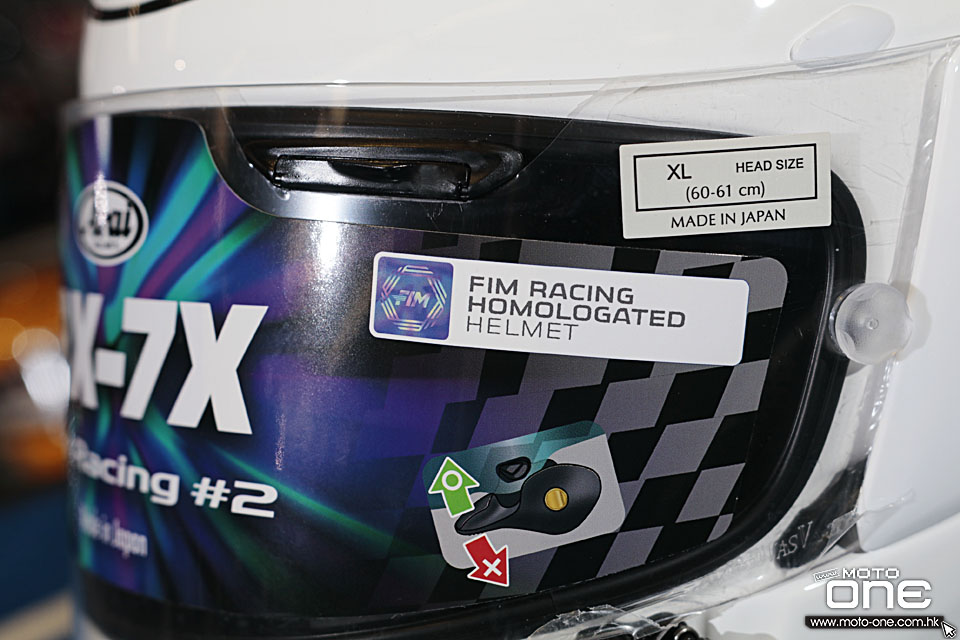 ARAI RX-7X FIM RACING #2 - FIM FRHPhe-02 最高級安全認證的賽車全面頭盔 FIM 於 2023 年 11 月正式公布,這款Arai RX-7X FIM RACING #2 新頭盔已取得新一代 FRHPhe-02 頂級賽車頭盔安全認證,並可即時用於 FIM 賽道賽事;其後 Arai 亦確認,所有外殼尺碼均已通過相關標準。近日,ARAI 最新的 RX-7X FIM RACING #2賽車頭盔到港,原裝已附有尾擾流板,無需另購,並有黑與白兩色可供選購。
