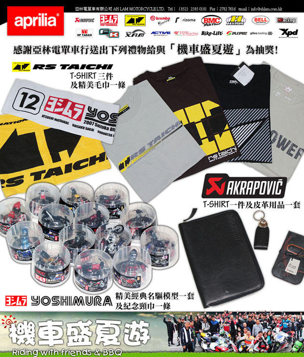 ![]() --------------------------------------------------------------------------------------------------------------------- ![]() ![]() 相關內容:恆迅新到服飾裝備(雨衣、手套、頭盔) --------------------------------------------------------------------------------------------------------------------- ![]() 感謝亞林電單車行送出下列禮物給與「機車盛夏遊」為抽獎﹗ RS-TAICHI T-SHIRT三件及精美毛巾 AKRAPOVIC T-SHIRT一件及皮革用品一套 YOSHIMURA 精美經典名驅模型一套及紀念頸巾一條 --------------------------------------------------------------------------------------------------------------------- ![]() 「機車盛夏遊」既獎品又再加碼,薄餅專門店Pizza & Chicken送出三個二人套餐俾車友享用,真係多謝晒。好運抽到呢份獎品既愛心車友嘆完BBQ唔夠喉,可以開車到佢地既分店食多餐。 --------------------------------------------------------------------------------------------------------------------- ![]() 三禾摩托除了送出100個HJC羅倫素花頭盔鎖匙扣外,還贈予「機車盛夏遊」最新抵港的HJC R-PHA JET 頂級開面型號及HJC CL-ST 99 Jorge Lorenzo 中階羅倫素拉花各一頂,合共HK$3,460,非常多謝三禾摩托鼎力支持。