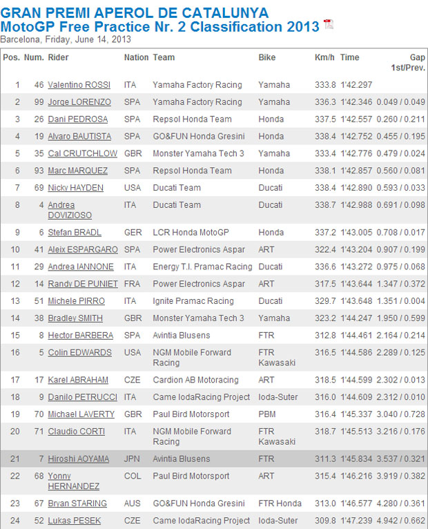 在6月14日舉行的西班牙Motogp兩場自由練習賽中(FP),羅絲雖然在FP1只造出第4快圈速,但在FP2卻造出最快的1’42.297圈速,希望他能夠在週六舉行的排位賽取得頭車起步資格。而FP2的第二名及第三名分別是大熱的羅倫素及柏度莎,上場與羅絲碰撞的捌弟排第4名,勇猛的卡滋奴(Cal Crutchlow)第5名。而老虎仔馬坤斯不知道是不是不欲重蹈上場頻密跌車覆轍,FP1及FP2分別造出第9及第6快。
