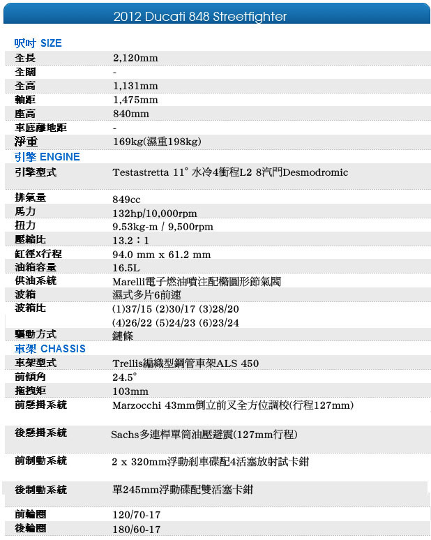 之前說2009 Ducati Steetfighter 1100極端,是因為車輛像只換了闊軑把的Superbike,俯伏的座姿及超牛的低扭輸出,對一般駕駛者而言,在街道上使用較吃力,所以車輛很明顯為老手而設,以致Streetfighter未得獲得市場垂青。但車廠似乎心有不甘,隨著新款中量級Ducati 848 Evo在今年推出後,Ducati亦希望為Streetfighter收復失地,因此以848 Evo為基礎,加入全新鋁合金尾擔、重新調整的車架幾何、11°進排氣結構、改善頭、中馬力輸出反應,還有新呎吋尾輪胎等等,目的是增加車輛的易駕性,使她更User-Friendly。