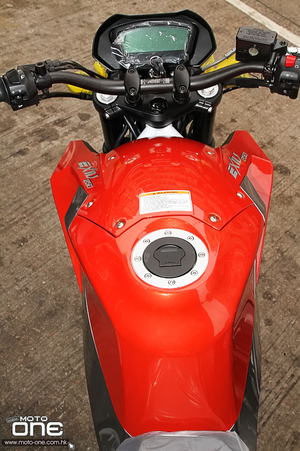 2014 HYOSUNG GD250N(X-5) 四色同時抵港+開箱記 售價HK$36,800 本年HYOSUNG的重頭作品GD250N(X-5)街頭戰士,首批共十多台新車在中午正式抵逹本港總代理恆迅的陳列室,場面非常鼎盛壯觀。在一眾工作人員忙個不停開箱組裝同時,本誌拍下他們勤力的實照與GD250N(X-5)新車全貌相片,火速報度,而想一睹實物的讀者可於明天到陳列室觀看。 今次,GD250N(X-5)共有黑、白、橙紅、藍四色同時登場,售價為HK$36,800,極俱市場的競爭力。而且恆迅將會舉辦預約試車服務,詳細請留意本誌的資訊。 Hyosung X-5-街頭戰士風格(技術講解) Hyosung X-5在去年舉行的德國科隆車展率先亮相,由於展出後反應良好,因此廠方決定投產。 屬街車款的Hyosung X-5採用單缸250cc的引擎,車身採用硬朗及肌肉感極強的線條包裝,使車輛的剛陽味十足,名符其實是一台Streetfighter(街頭戰士)風格的電單車,與同廠走實用路線的GT250有截然不同的風格。 車輛使用鋼管車架,尾擔以鋁合金製作,1340mm輪距、37mm倒立前叉及及單筒尾避震,而一對輪框也有大排車風格,加上引擎底設有肚兜,有效提升戰鬥格的形象。 ●共18台新車同時抵港。 ![]() 從整份資料可看到廠方針對操控性進行設計,例如真油缸位置設定在車輛正 中央,並且延伸至接近尾擔樞軸位置,這設計是仿傚落場的SUPERBIKE及MOTOGP,目的是讓重心集中在車輛中間位置,使重量有更佳的分佈,從而提 升車輛的操控性能。 ●引擎內置平衡軸,可減低引擎的震盪 ●由於引擎擔當車架的角式,因此與車架連接的部位經過補強,這流行的設計其中好處是減輕重量 ●配備6前速近牙波箱 冷卻系統的恆溫感應器設在盤頂上 ●馬力:28.4hp / 8,500rpm ●扭力:2.56kg-m / 7,000rpm ![]() ●引擎、油缸、排氣管及電池設在車輛中央位置,更佳的重心提升駕駛樂趣及操控性。