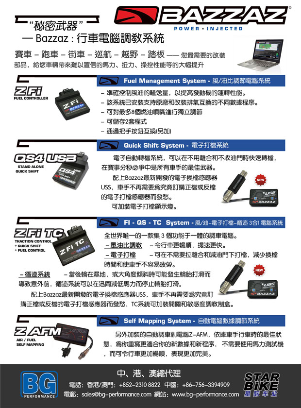 BAZZAZ:行車電腦調教系統 賽車 - 跑車 - 街車 - 巡航 - 越野 - 踏板 給您車輛帶來難以置信的馬力、扭力、操控性能等大幅提升。 另外,BG由英國引進中國的BAZZAZ馬力機,第一台已經在北京落戶,可以為車友在裝上BAZZAZ行車電腦後,微調車輛的馬力,扭力,電子打檔性能,循跡系統等等。