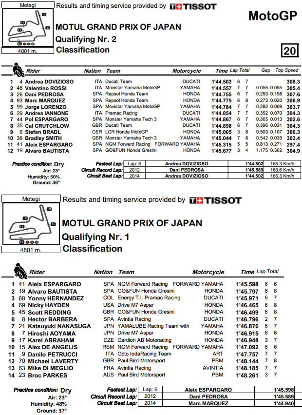 畢竟排位賽事只進行了一半,意味著新紀錄陸續有來,隨後多位車手更不斷刷新紀錄,包括羅倫素、馬坤斯及柏度沙等等。直至賽事進入尾聲後,久違了頭車位置的DUCATI剎出重圍,杜域斯柯素炮製了一箭定江山的1'44.502超快圈速,周日將排第一位起步,而DUCATI對上一次頭位起步已是四年前的事。本來已墮後的羅絲也在最後關頭成功突圍而上,取得第二位起步位置,雖然柏度莎在最後一圈發生LOWSIDE意外,無阻他取得第三位起步資格。