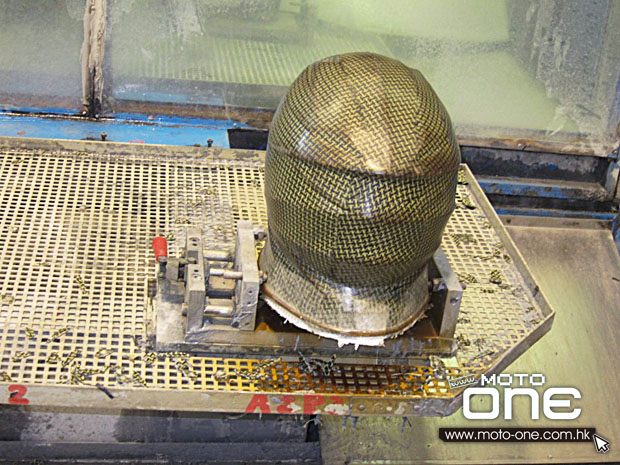 工廠裡的生產線是全自動化,除了需要有高技巧的工人將碳纖切割和鋪設玻璃纖維織物到真空鋼制模具的工序,這是一道非常重要的過程,因為當頭盔受到重力撞擊時,不同材料鋪設的位置和角度決定了頭盔的堅固性。因此,這道工藝對技工的嫺熟技能和經驗都有很高的要求。