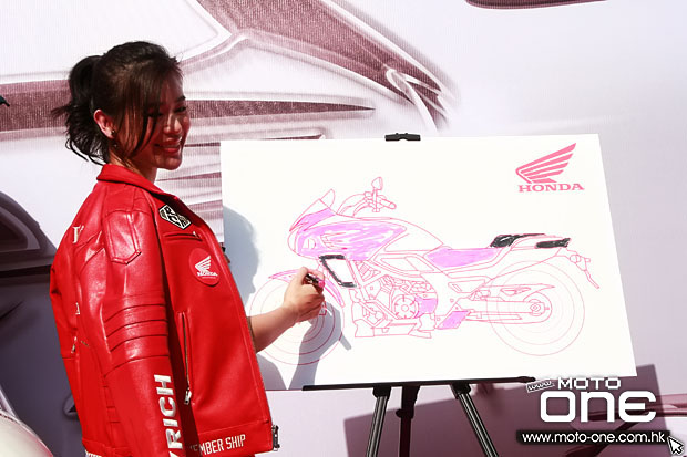 其後,胡杏兒小姐作為「Design Your Own NM4」創意設計比賽 & MSX 小車大變身比賽活動的頒奬嘉賓,將現金支票給與眾得奬者後,更進行Honda CTX700 ABS拉花設計小遊戲及分享她對電單車的喜愛與欣賞。