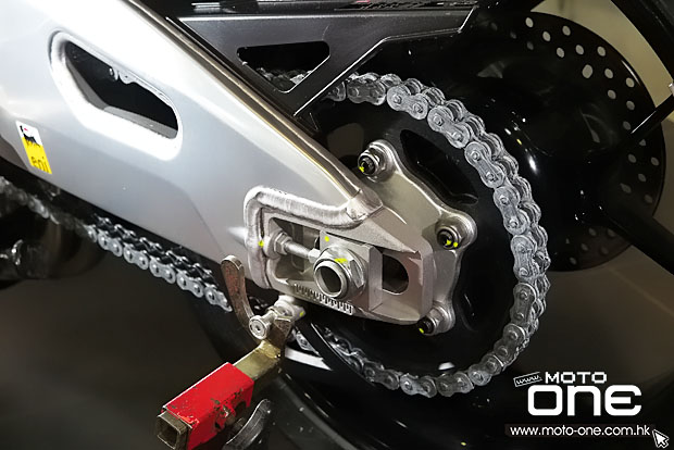 氮氣輔助單筒油壓彈箕尾避震設全方位預調與無段式預壓,自然與前叉呼應,同ohlins(RR版為SACHS)是理所當然,外型與舊款TUONO存在相當差異,強化設計的前流罩具更低的風阻系數,鋁合金鑽石形車架看似與舊款無異,其實已被廠方精心改良,前傾角、拖曳距也跟舊款割蓆,前傾角比前收窄了0.4度至24.7度,拖曳距減了7.7mm至99.7mm,請勿低估如此小數字,修窄前傾角可帶來更靈活的轉向,為迎合175ps大馬力輸出,就連「拱橋式」鋁合金尾擔也加長了4mm,直接提升轉向的準繩與高速行車的穩定性。
