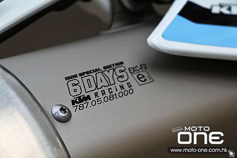 KTM 350 EXC 6 DAYS特別版,與Factory Edition版的規格分別不大,但換上大量更多搶眼的Kit料及貼有6 DAYS耐力賽特別花貼子,就連原裝排氣管也有6 DAYS標誌。除此之外,特別版使用WP全新設計的4CS前叉,這個有別於傳統前叉結構的新設計,據廠方描述擁有非常高的吸震性及抗傾性,好處是使用更少部件有助減輕重量,新結構也方便更換避震油,新前叉頂同樣是左方調校壓縮、右方調校回彈。