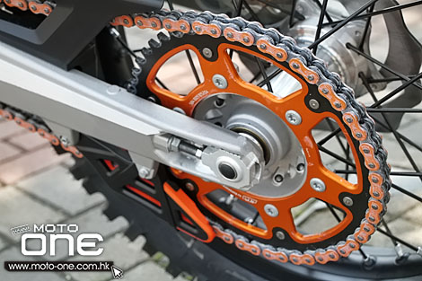 既然換了新叉,6 DAYS特別版同樣添加了耀眼奪目的CNC鮮橙色上下Kit眼鏡,車架也塗上了代表KTM的廠色,還有橙色車鏈與護板、橙色水箱散熱柵等等橙色力量裝備。並且增入新頭碟保護冚、Camel seat駱駝形後座及尾牙採用Supersprox兩組合製,外鋼內圈是輕量化鋁合金,提高耐用性與美觀度。而前後鋁合金輪框也鍍上了黑壓壓的碳黑色及印有6 DAYS的圖案。