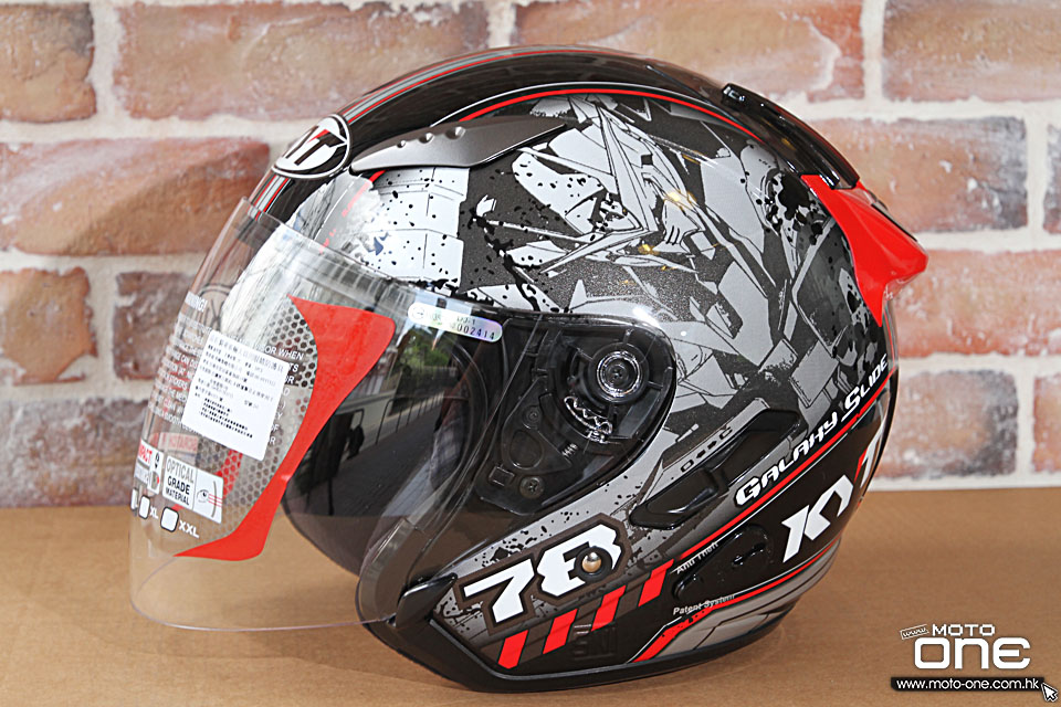 今次的KYT Galaxy Slide GUNDAM高達花備有紅黑、橙黑、藍黑三色,每色的拉花設計相同,頭盔兩側印有銀色的RX-78高達及78編號,富有機械感的線條,加上以高達為主題的頭盔市場上並不多,這款KYT GUNDAM高達花俱有相當的吸引力。