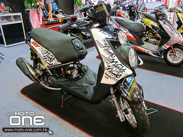 一間銷售及自行研發改裝補品的公司,展出自行改裝的BW'S作品。包括全方位調校的尾避震,軑把、前叉及卡鉗等等,還有將部份包圍、傳動外殼及風鼓蓋移除,以達致偷輕及提升散熱效能。 清晰看到防塵風隔及傳動系統。
