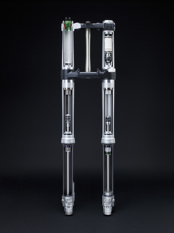 ●3個氣室的SHOWA SFF-AIR TAC氣壓倒立前叉,設22度壓縮與20度油壓回彈,總行程310mm。