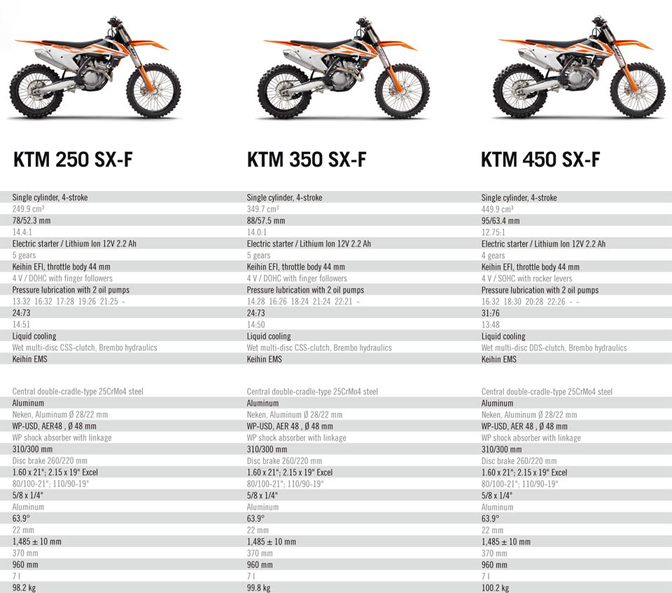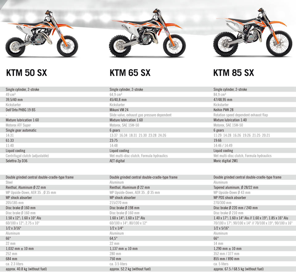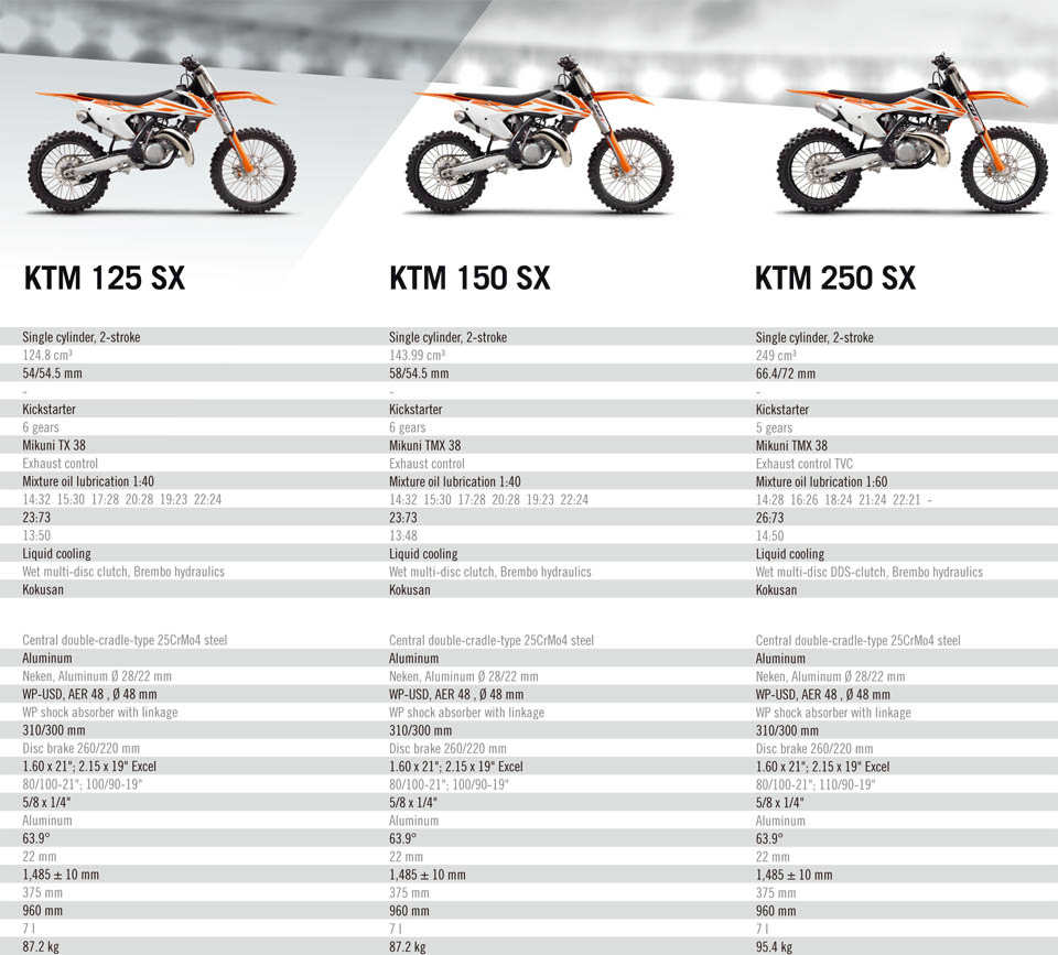於KTM SX車系中,包含了符合參加450及250組別的戰馬。4衝行列分別有450 SX-F、350 SX-F及250 SX-F,而F代表Four Stroke(4衝程)。2衝行列則有250SX、150SX、125SX,還有初學者駕駛的85 SX 17/14、85 SX19/16、65SX、50 SX MINI(迷你)及50SX。