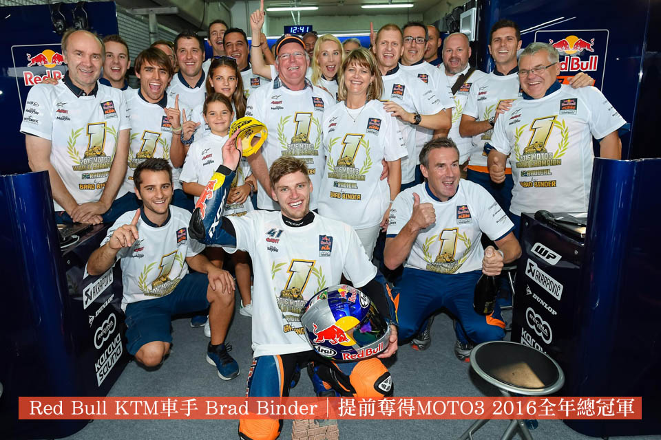Brad Binder是年僅21歲南非藉的MOTO3電單車手,今年效力Red Bull KTM MOTO3車隊,使用KTM RC 250 GP戰車比賽。在西班牙阿拉崗站中,Brad Binder雖然只奪亞軍,但經過2016年14回合的MOTO3比賽後,KTM紅牛車手 Brad Binder已經取得249分,與第二名143分的Jorge Navarro擁有106分的差距,在僅餘4站之下(最多100分),Brad Binder已取得足夠的總分,成功奪得MOTO3 2016全年總冠軍。也為Red Bull KTM MOTO3車隊繼2012 Sandro Cortese車手奪冠後,第二度取得Moto3年度總冠軍。