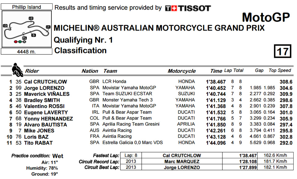 澳洲站備受不穩天氣影響,增添車手及車隊選用光頭胎、雨胎或半乾濕輪胎(Intermediate)的難度,已提前奪得世界冠軍的馬坤斯及他的成員表現臨危不亂,給人在控制大局的感覺下奪得澳洲站排位賽第一名。而YAMAHA那邊像似不斷發生亂子,羅倫素及羅絲只能在排位賽取得12及15名。
