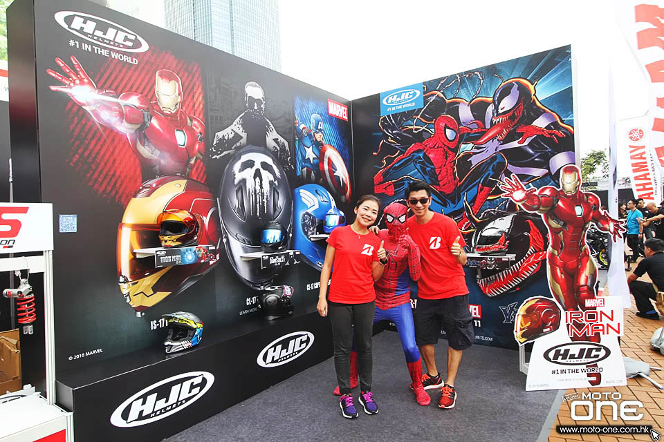 BRIDGESTONE輪胎│HJC MARVEL英雄頭盔│三禾精心的場景佈置│2016香港電單車節 今年香港電單車節的三禾展區,分為了兩個主要的項目,就是BRIDGESTONE輪胎與HJC MARVEL英雄頭盔,在精心的場景佈置下,非常鮮明與突出。展區內,還有標緻可人的BRIDGESTONE 靚女 MODEL及免費送出MARVEL FILE,仲有SPIDERMAN與參觀者合照,豐富的安排,令攤位人氣一直高漲。