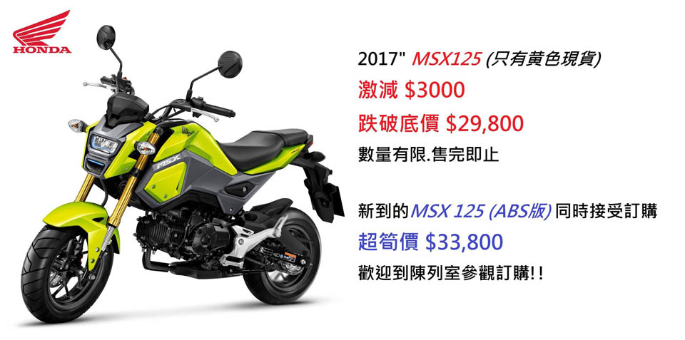 2017 HONDA MSX125│激減HKD$3000│超抵價HKD$29,800│只有黃色現貨 數量有限﹐售完即止。