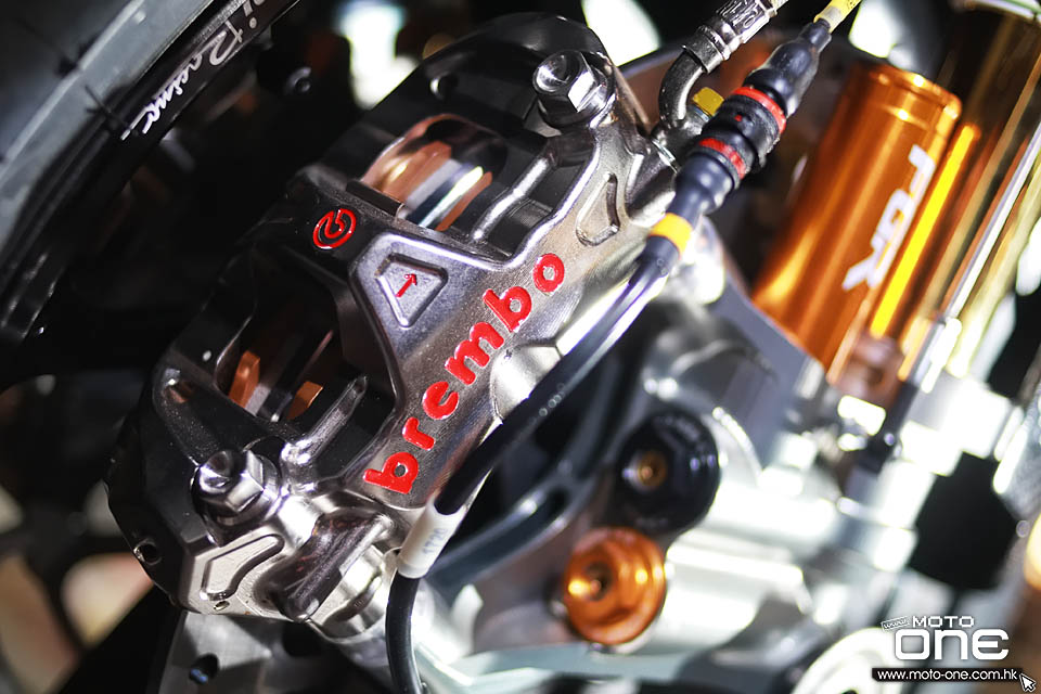 ●直徑達336mm的Brembo"T"drive不鏽鋼煞車碟是非一般煞車碟,不止直徑較一般超電採用的煞車碟大,6mm厚度也較一般煞車碟厚,這是沒有市售的裝備。煞車卡鉗是4活塞放射式的Brembo monoblock。