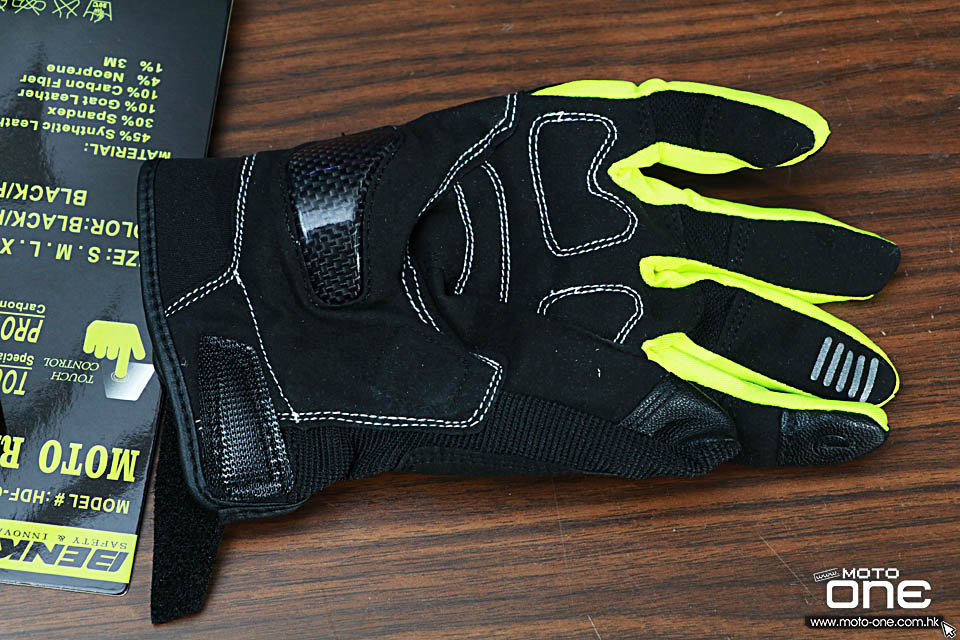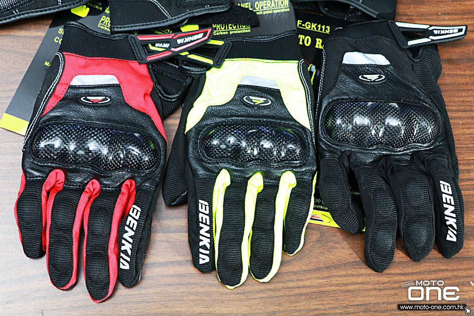 BENKIA 男、女裝騎士短手套 BENKIA 男裝騎士短手套顯得更賽車化,在手背的保護殼及手掌的保護滑動板(於意外時接觸地面產生滑動效果,避色手掌直接的衝擊,減輕受傷的作用)均碳纖維製造,手指關節亦有加強保護。食指及姆指備有觸屏布料,可不用脫下手套而使用智能電話,方便使用。還有,BENKIA 男裝騎士短手備有全黑、黃黑及紅黑等三種色彩選擇。