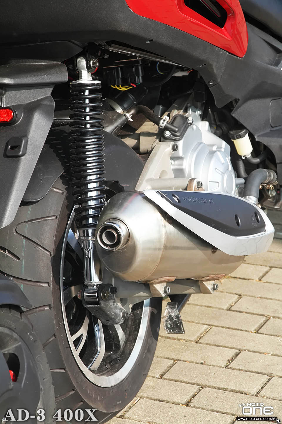 ●新款ADIVA AD3 400採用原裝標緻PEUGEOT排氣管,並且配置新色的尾搖臂及傳動系統,尾煞車碟也從右置改為左置式,而新的14吋輪框較舊款13吋輪框在直路行駛時有更穩定表現。