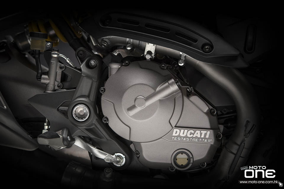 ●水冷四衝程 L2雙汽缸Testastretta 11°度 Desmodromic 4汽門引擎,自從Ducati Testastretta 11°引擎面世後,大大改善低扭的易駕度,同時減低油耗。