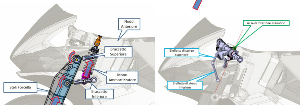 雙願骨/雙搖臂(Double Wishbone)前避震 事實上,Duecinquanta街道版及Duecinquanta賽道版除了超輕外,結構與過去的2衝250與別不同,前避震採用雙願骨/雙搖臂(Double Wishbone)設計,結構與BMW的Duolever及新款HONDA GOLDWING接近,單筒吸震彈簧設於軑把下,並由雙搖臂連接一對碳纖維製造的前叉,該類避震有防俯衝優點,減速時俯衝力量大減,車身更穩定,但駕駛初需要時間適應。