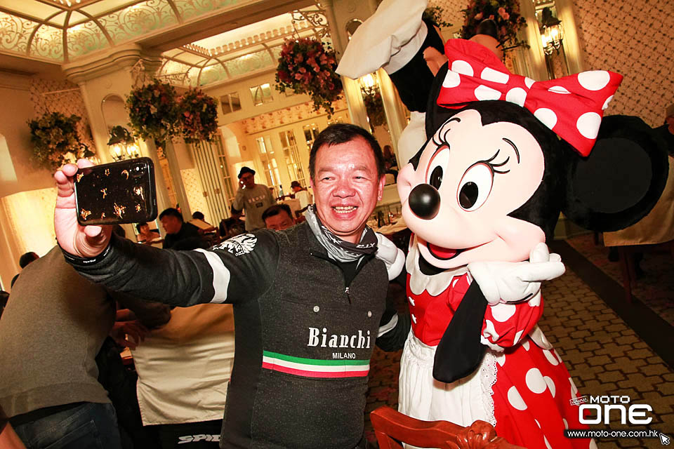 「MotoPlex百騎巡遊」超過100輛電單車抵達香港迪士尼舉酒店的停車場,排好靚陣型後,先進行大合照的活動,由全員大合照開始、再到Vespa Club Hong Kong、Hong Kong Scooter Power、Moto Guzzi Club Hong Kong、Aprilia Club Hong Kong等等分組的合照。當然,難得面對難得4大車會組合的靚陣,許多車主乘勢拍照留念,然後到香港迪士尼酒店享用豐富的自助午餐。