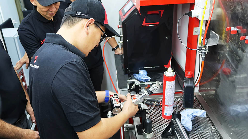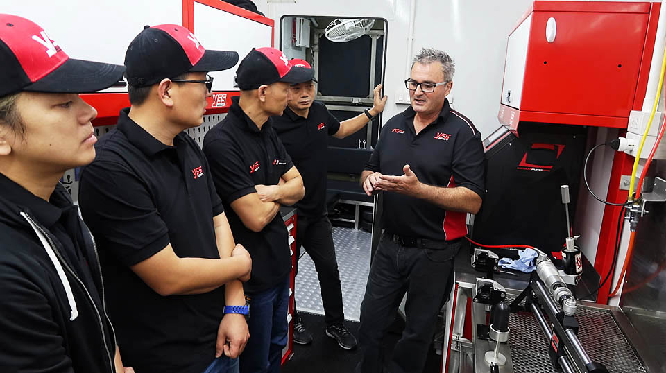 說回今次課程,包括YSS尾避震、前叉、釘把各方範疇,從結構、部件的特性及理解,裝嵌與拆解過程,各項專用協助工具的運作、實際使用操作及調校工作,一一齊備。在YSS廠方備有大量為學習的專業工具(如已經切割的避震)及各式電腦文件資料,加上豐富經驗的Greg Smith教導及學員親身動手學習下,一行人對YSS避震有更深了解,獲益良多,對往後銷售及售後服務有更佳的幫助。