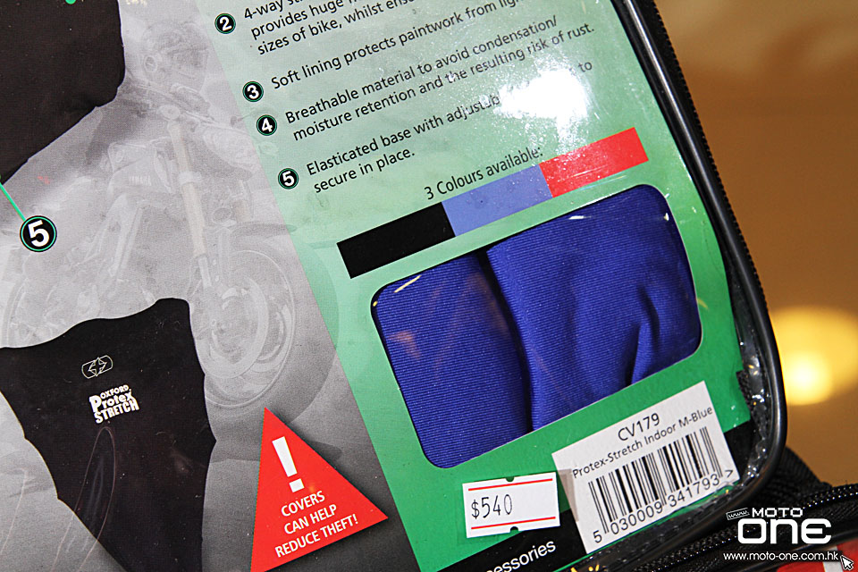 電單車無論停泊室內室外,總會受到天氣、濕度或其他因素影響,加速老化現象。如不想這樣,一個俱保護性的車冚可有效減低問題發生。是次,翔利新返了英國著名品牌Oxford最新的OXFORD PROTEX STRETCH車冚,備有室內(室內備有紅、藍、黑等三色選擇)與室外的型號,保護你的愛驅。