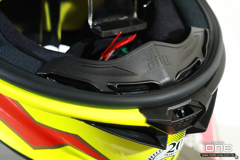 此頭盔以Rossi 在首場勝利所配戴的頭盔作為藍本,左右印有Rossi 經典日月花圖案,並以螢光黃取代舊有的黃色,前面印有Rossi 20週年特別版logo, 後面印有一段日文,是“Rossifumi 加油”的意思,“Rossifumi”是Rossi早年為自己取的綽號,因為他是已故日本車手阿部典史的超級支持者,為表示對阿部典史的尊敬,特別將這個綽號放在這頂20週年頭盔上。