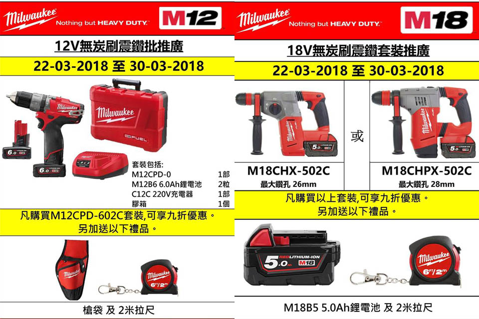凡購買M18CHX-502C或M18CHPX-502C套裝,可享九折優惠,另加M18B5 5.0Ah鋰電池及2米拉尺禮品。