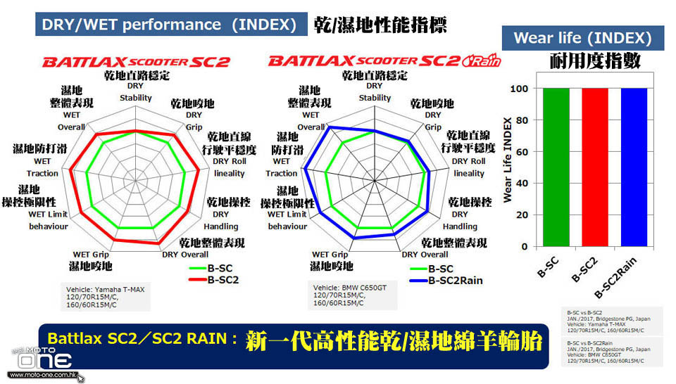 SC2及SC2 RAIN採用的胎紋與製造物料,均與上一代SC有所不同。由於SC有上佳的耐用度,所以SC2及SC2 RAIN的耐用度方面與SC持平,但全面提升乾濕地的性能及操控度,大家可從官方的圖表可看出比較。